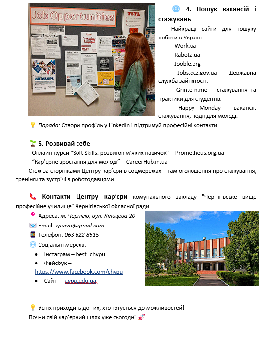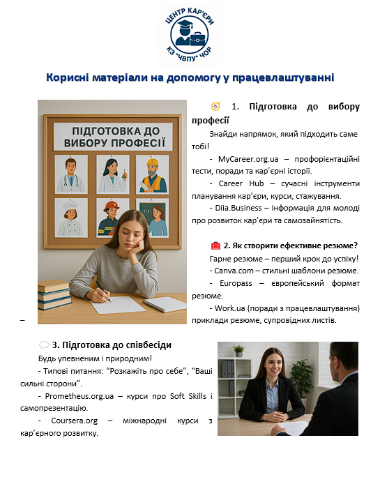 Цей розділ ще перебуває в розробці… Положення про Центр кар’єри. Меморандум про співпрацю та партнерство з обласним центром зайнятості. План роботи Центру кар’єри на 2025-2026 н.р.. План роботи Центру кар’єри на 2024-2025 н.р..